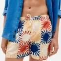 Swim short with a straight cut featuring an inner mesh lining, elastic waistband with drawstring, side pockets, and a back pocket with snap closure. This sun-printed swimwear is made from recycled polyester.